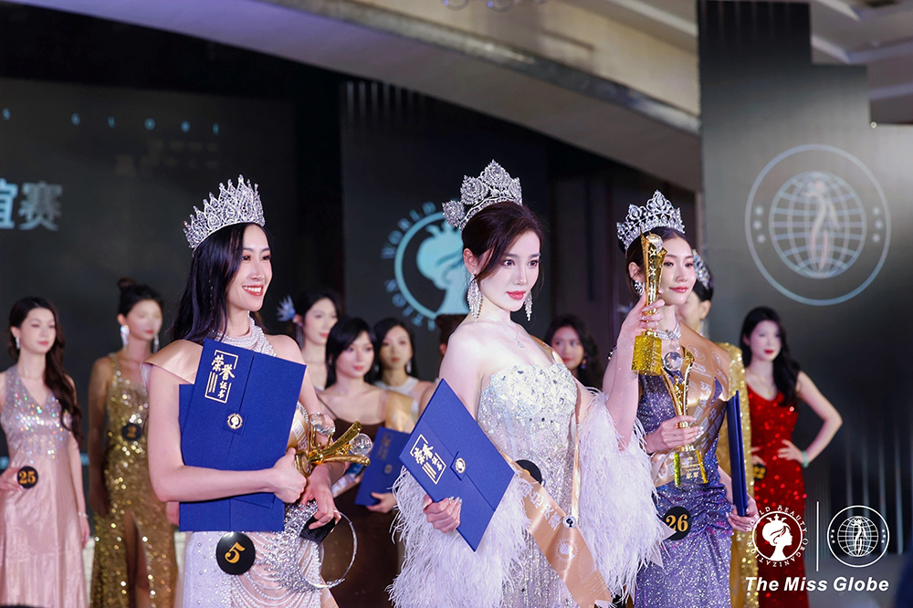 图:2025全球国际蜜斯中国总决赛三甲(左一:亚军禾芯弈、中:冠军朱琳、左一:季军王译敏)